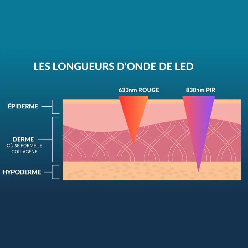 - Lumière bleue (470 nm): Attaque les bactéries responsables de l'acné et équilibre la production de sébum.